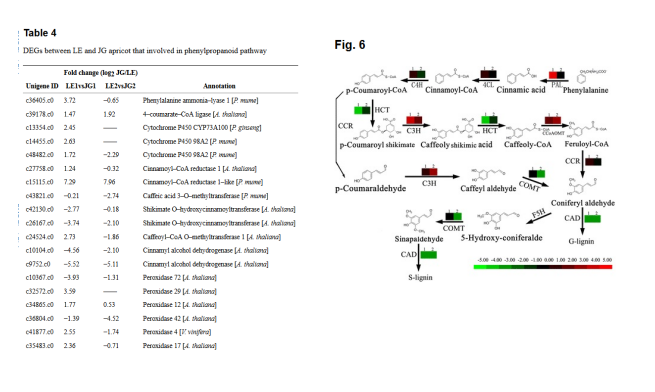 a)LE品種內(nèi)果皮破裂與發(fā)育不全是一個(gè)非常復(fù)雜的表型,與眾多的代謝通路相關(guān),但類苯基丙烷相關(guān)通路是眾多代謝通路中已經(jīng)證實(shí)的非常重要的一個(gè)。該項(xiàng)目中對(duì)兩個(gè)品種在兩個(gè)時(shí)間點(diǎn)的差異表達(dá)基因的KEGG富集分析結(jié)果也證實(shí)了上述事實(shí),所以差異基因顯著富集于類苯基丙烷代謝、合成等通路。類苯基丙烷相關(guān)通路相關(guān)差異表達(dá)基因見(jiàn)列表4與圖6。