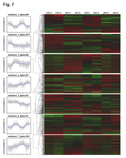 a)文章最后,使用K-means聚類對(duì)之前得到的差異表達(dá)基因進(jìn)行了共表達(dá)分析,分析結(jié)果顯示:基于表達(dá)趨勢(shì),所有差異基因可劃分為7個(gè)cluster,每個(gè)cluster內(nèi)部的基因具有相似的表達(dá)趨勢(shì),也就可能在細(xì)胞內(nèi)行駛著相似的功能,聚類結(jié)果見(jiàn)圖7。 b)之前分析得到的內(nèi)果皮發(fā)育相關(guān)基因大多分布在cluster1或者cluster6,cluster1中的基因在LE品種中高表達(dá),JG品種低表達(dá),cluster6與cluster1相反。