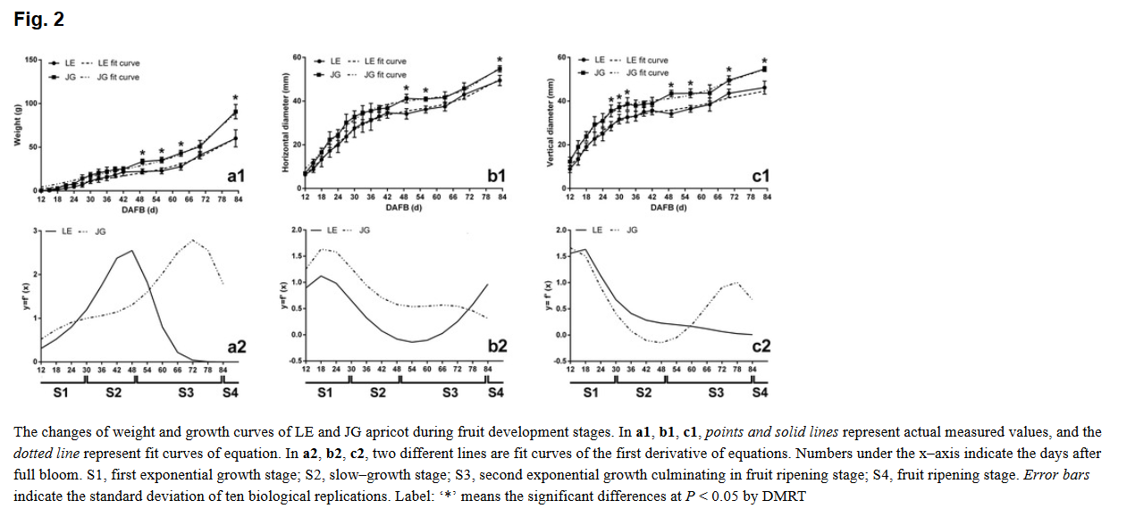 a)如圖2所示,兩種品種杏的果實(shí)具有相似的發(fā)育模式,a1、b1、c1是以開(kāi)花后時(shí)間(DAFB)為橫坐標(biāo),分別以果實(shí)重量、果實(shí)長(zhǎng)度、果實(shí)寬度為縱坐標(biāo)做圖,兩種杏的果實(shí)均呈現(xiàn)出了“雙S曲線”生長(zhǎng)模式,圖a2、b2、c2是分別對(duì)a1、b1、c1一階導(dǎo)數(shù)作圖,兩種果實(shí)同樣也表現(xiàn)出相似的趨勢(shì)。 根據(jù)生長(zhǎng)曲線,研究者將果實(shí)的發(fā)育劃分為4個(gè)時(shí)期:第一次指數(shù)生長(zhǎng)期(before 30DAFB)、緩慢生長(zhǎng)期(30-49DAFB)、第二次指數(shù)生長(zhǎng)期(49-83DAFB)、成熟期(after 83DAFB)。