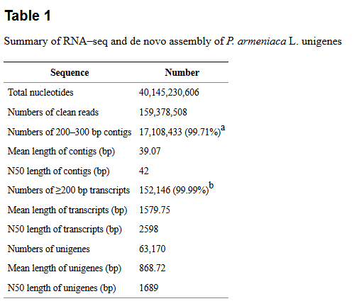 a)測(cè)序取樣部位 : 去核后的果實(shí),每個(gè)品種兩個(gè)生物學(xué)重復(fù) 測(cè)序取樣時(shí)間點(diǎn) : 根據(jù)上一部分的表型觀察結(jié)果,LE品種內(nèi)果核在15DAFB時(shí)出現(xiàn)裂縫,在24DAFB時(shí),裂縫程度開(kāi)始快速增大,因此,該mRNA測(cè)序項(xiàng)目選擇了15DAFB和24DAFB兩個(gè)時(shí)間點(diǎn)樣本 b)轉(zhuǎn)錄本組裝:測(cè)序共得到~20Gbase clean data,使用Trinity軟件組裝得到63,170條unigene,unigene N50大小1689bp,詳細(xì)組裝結(jié)果參見(jiàn)表1。