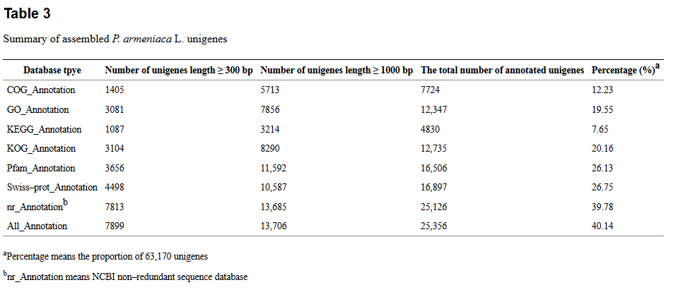 a)基于blast比對(duì),63,170條unigene中有25,356可比對(duì)到日本杏(Japanese apricot)與桃(peach)基因組數(shù)據(jù)庫(kù)。 b)使用BLASTx(e-value閾值設(shè)為10e-5)將上述25,356條unigene比對(duì)到NR, Swiss-Port, GO, COG, KOG ,kegg數(shù)據(jù)庫(kù)以進(jìn)行功能注釋,每條unigene均有多條注釋,詳細(xì)的注釋結(jié)果統(tǒng)計(jì)信息請(qǐng)參見(jiàn)表3. c)GO數(shù)據(jù)庫(kù)注釋過(guò)程中,16,506條unigene被注釋到,其中, ‘metabolic process’ (8408 genes, 50.93%)是被注釋到最多的GO 條目;KEGG數(shù)據(jù)庫(kù)注釋過(guò)程中,4830條unigene被注釋到了118個(gè)代謝通路。大部分的unigene被注釋到了‘carbohydrate metabolism’ (905 genes), ‘translation’ (596 genes), ‘a(chǎn)mino acid metabolism’ (581 genes), or ‘folding, sorting and degradation’ (471 genes)等代謝通路。