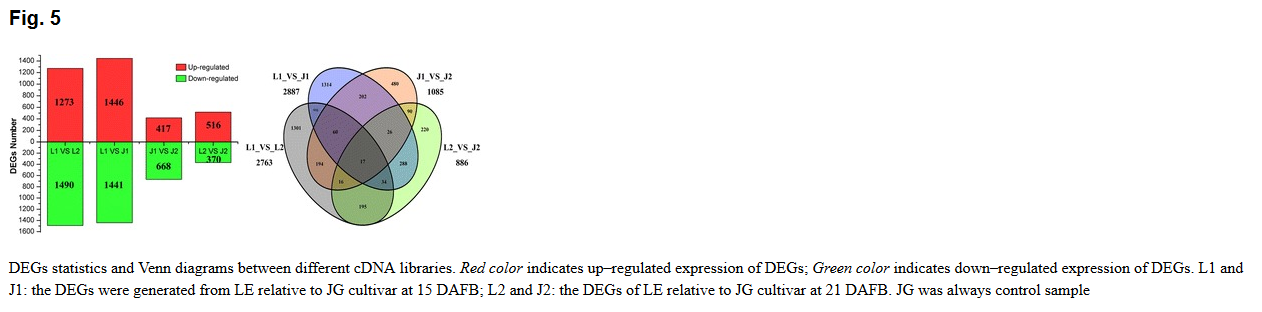 使用DESeq進(jìn)行了差異表達(dá)基因檢測(cè),差異表達(dá)基因篩選閾值為:FDR<0.01,F(xiàn)C > 2 。15DAFB時(shí)間點(diǎn)上,兩個(gè)品種間檢測(cè)到差異表達(dá)基因2887個(gè),24DAFB時(shí)間點(diǎn)上,兩個(gè)品種間檢測(cè)到差異表達(dá)基因886個(gè),具體上下調(diào)、共有特有情況請(qǐng)參見(jiàn)圖5.