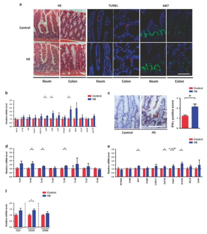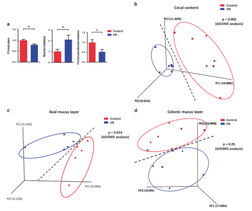 為了研究HS攝入如何影響腸道微環(huán)境,研究人員將HS組的細菌組成與對照組相比,在HS處理后,盲腸中Actinobacteria,F(xiàn)irmicutes和Bacteroidetes在門水平和Actinobacteria以及Clostridia和Bacteroidia的百分比顯著不同。unweighted uniFrac分析結(jié)果顯示HS和對照組分別聚集(圖2b)。進一步分析顯示,HS和對照組在回腸粘液層分別聚集(圖2c),而對照組和HS組形成兩個聚類,分離趨勢明顯在結(jié)腸粘液層(圖2d)。研究結(jié)果表明,慢性HS喂養(yǎng)可能導致腸道生態(tài)失調(diào),細菌計數(shù)和微環(huán)境組成的變化也證明了這一點。