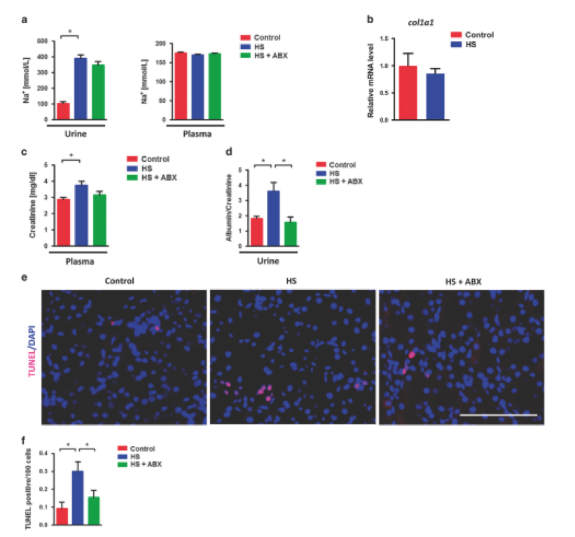 為了進一步闡明HS攝入后腸道生態(tài)失調(diào)和腎損傷之間的關(guān)系,給小鼠喂養(yǎng)多粘菌素B和新霉素??股亟o藥確實恢復了HS飼喂誘導的回腸Ifn-γ過表達,通過糞便白蛋白和FD-4滲透監(jiān)測腸道泄漏,以及通過血漿內(nèi)毒素水平和腎臟16s / 18s比率監(jiān)測的細菌移位,通過尿和血漿Na +濃度測量,抗生素不改變鈉負荷(圖5a)。雖然8周HS喂養(yǎng)并未引起纖維化等進展性腎損傷,但由col1a1 mRNA水平監(jiān)測(圖5b),HS喂養(yǎng)增加了血漿肌酐水平。更重要的是,與對照組小鼠相比,HS-喂養(yǎng)小鼠腎功能障礙的主要標志物尿白蛋白/肌酐比率顯著增加,抗生素治療幾乎可以完全恢復腎功能(圖5d)。另外,TUNEL染色顯示抗生素施用可以降低HS誘導的凋亡細胞的升高(圖5e和f)??傊?,該數(shù)據(jù)表明,抗生素治療能夠改善腸道滲漏和HS喂養(yǎng)引起的早期腎損傷。