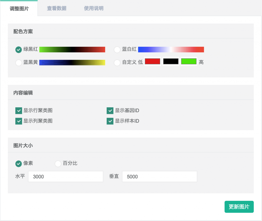 圖像編輯功能可實(shí)現(xiàn)熱圖顏色調(diào)整、樣本名修改、基因名修改、字體修改,同時(shí)支持png、pdf、svg不同尺寸圖片保存,方便大家在進(jìn)行文章投稿過程或日常數(shù)據(jù)整理過程中對(duì)圖片的修改。